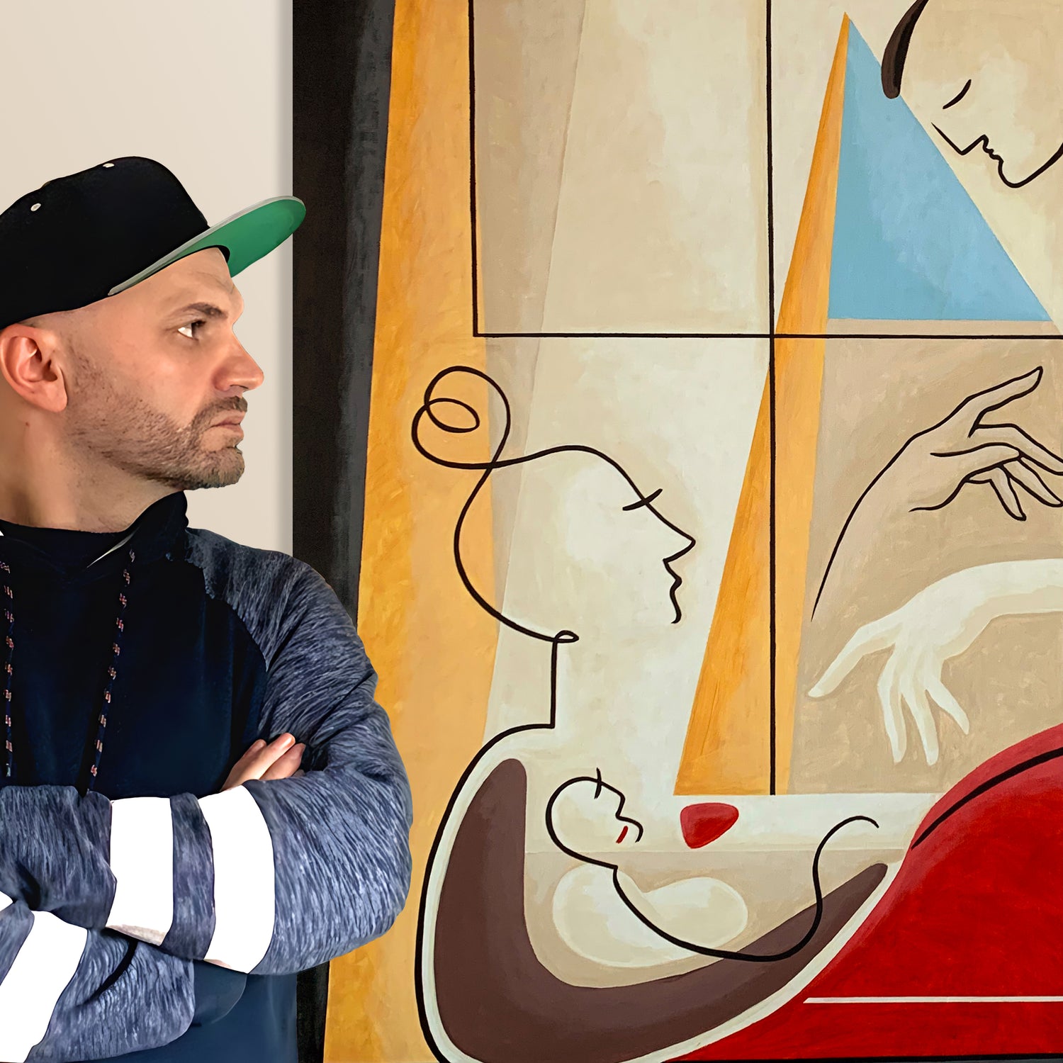 A black or subtly colored contour functions as a unifying element throughout his work, linking figures, space, and horizon.